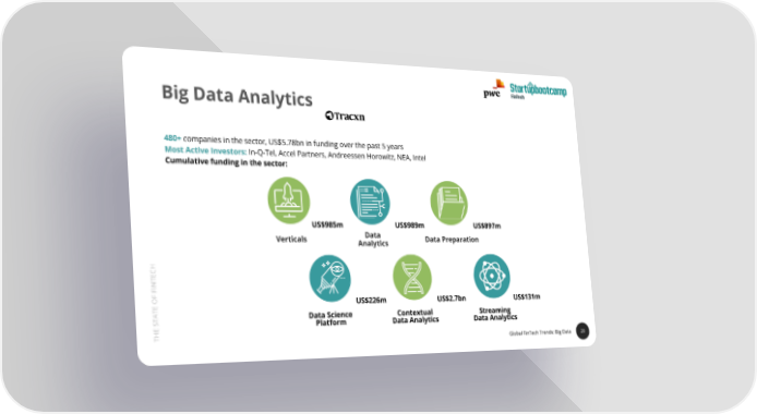 Big Data Analytics 480+companiesinthesector,US$5.78bninfundingoverthepast5years MostActiveInvestors:In-Q-Tel,AccelPartners,AndreessenHorowitz,NEA,Intel Cumulativefundinginthesector: US$985m US$989m US$897m Verticals Data Data Preparation Analytics CH TE N I F F O US$226m US$2.7bn US$131m TE TA Data Science Contextual Streaming S Platform Data Analytics Data Analytics E TH Global FinTech Trends: Big Data 28