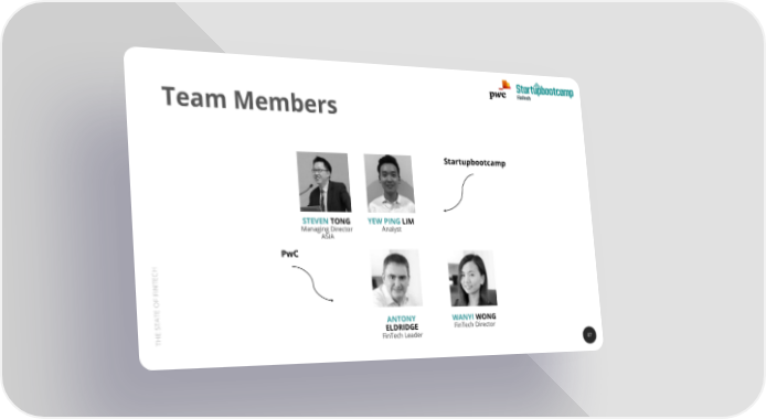 State of FinTech Report | PwC & SBC Page 86 Page 88Team Members Startupbootcamp STEVEN TONG YEW PING LIM Managing Director Analyst ASIA PwC CH TE N I F F O TE TA ANTONY WANYI WONG S E ELDRIDGE FinTech Director TH FinTech Leader 87