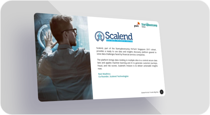 26 Scalend, part of the Startupbootcamp FinTech Singapore 2017 cohort, provides a ready to use data and insights discovery platform geared to solve data challenges faced by financial services companies. The platform brings data residing in multiple silos to a central secure data lake and applies machine learning and AI to generate customer journeys, fraud, and risk scores. Scalend’s mission is to deliver actionable insights now. CH RaviMadhira TE Co-founder,ScalendTechnologies N I F F O TE TA S E TH Global FinTech Trends: Big Data 26