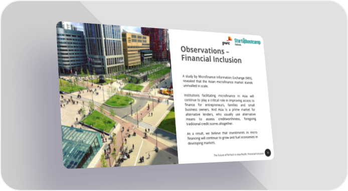 Observations – Financial Inclusion A study by Microfinance Information Exchange (MIX), revealed that the Asian microfinance market stands unrivalled in scale. Institutions facilitating microfinance in Asia will continue to play a critical role in improving access to finance for entrepreneurs, families and small business owners. And Asia is a prime market for alternative lenders, who usually use alternative means to assess creditworthiness, foregoing CH traditional credit scores altogether. TE N I F As a result, we believe that investments in micro F O financing will continue to grow and fuel economies in TE developing markets. TA S E TH 58 The Future of FinTech in Asia Pacific: Financial Inclusion 58